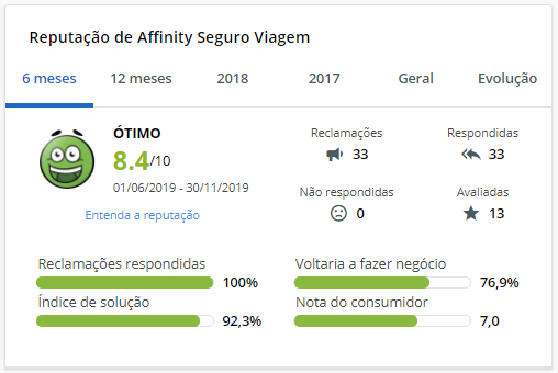 A Affinity Seguro Viagem conquistou o primeiro lugar com a nota 8,4 e a classificação “ótimo”.