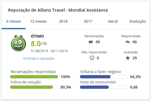 A empresa Allianz Travel – Mondial Assistance fica na segunda colocação com a nota 8,0 e a classificação “ótimo”.