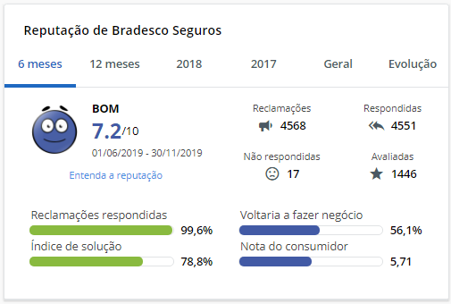 Em último lugar da nossa lista aparece a Bradesco Seguros com a nota 7,2 e classificação “bom”.