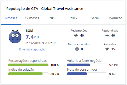 A empresa GTA – Global Travel Assistance conquistou o 6º lugar no ranking com a nota 7,4, classificação “bom” e 46 reclamações registradas.
