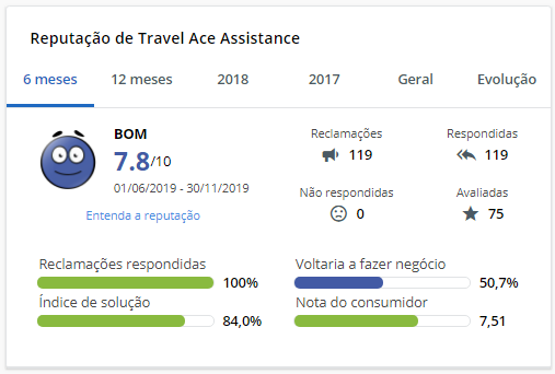 Em terceiro lugar aparece a Travel Ace Assistance com a nota 7,8 e a classificação “bom”.